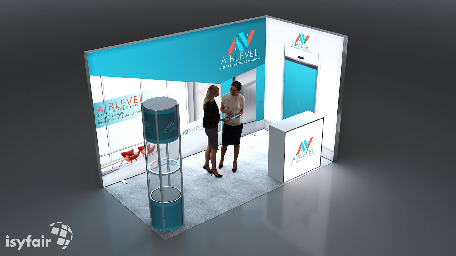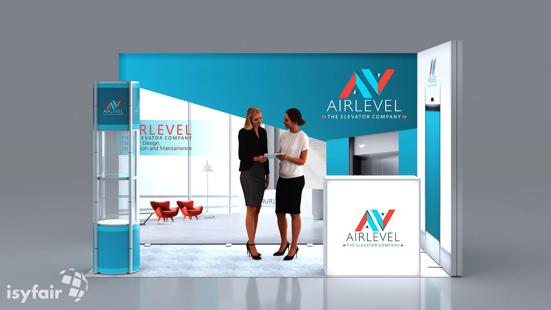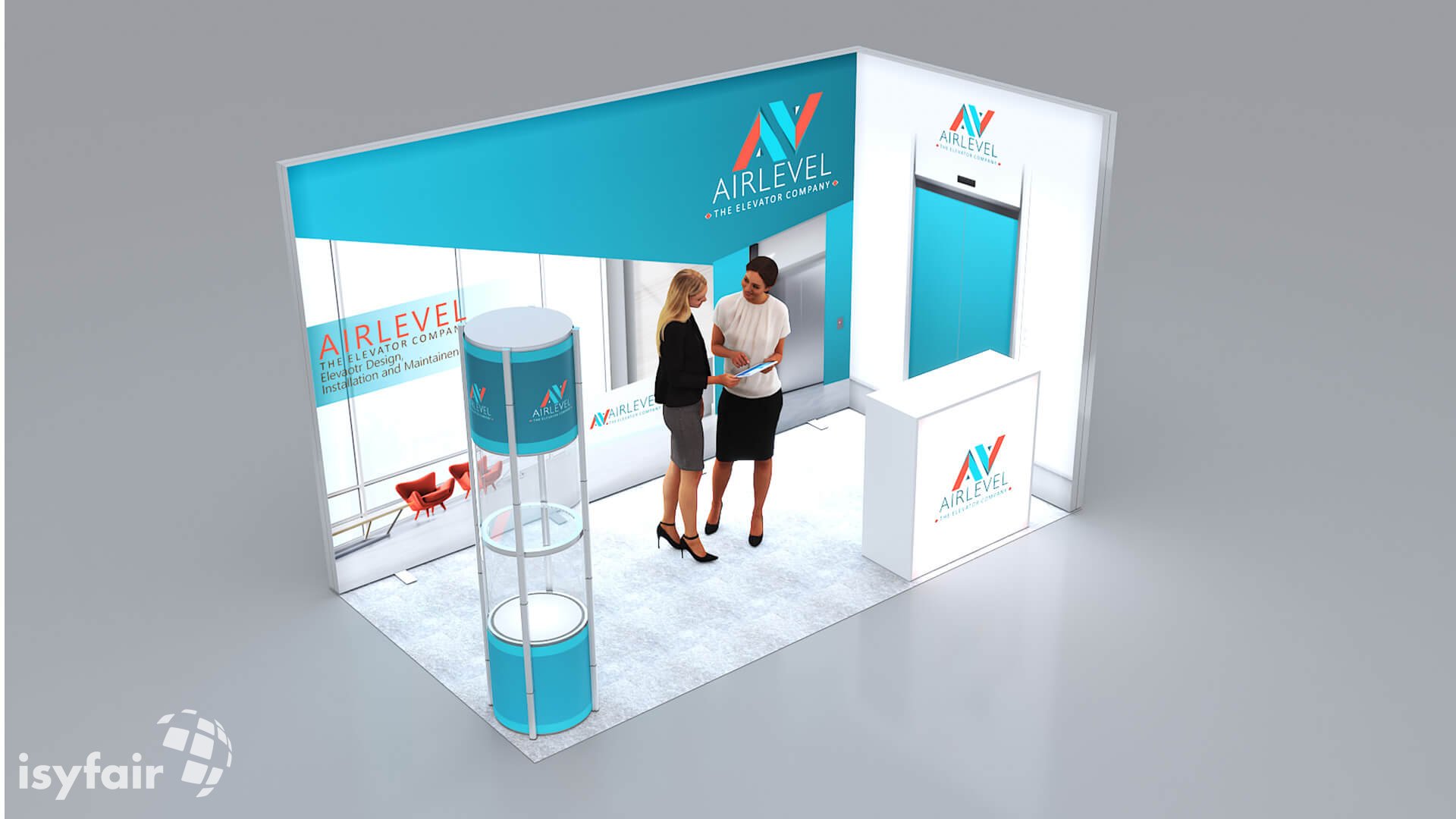 Dieses Messestand Design ist selbstverständlich an Ihre Vorstellungen anpassbar. Senden Sie uns dazu einfach eine E-Mail an - info@ISYFAIR.com oder rufen Sie uns an: +49 6722 9372-234