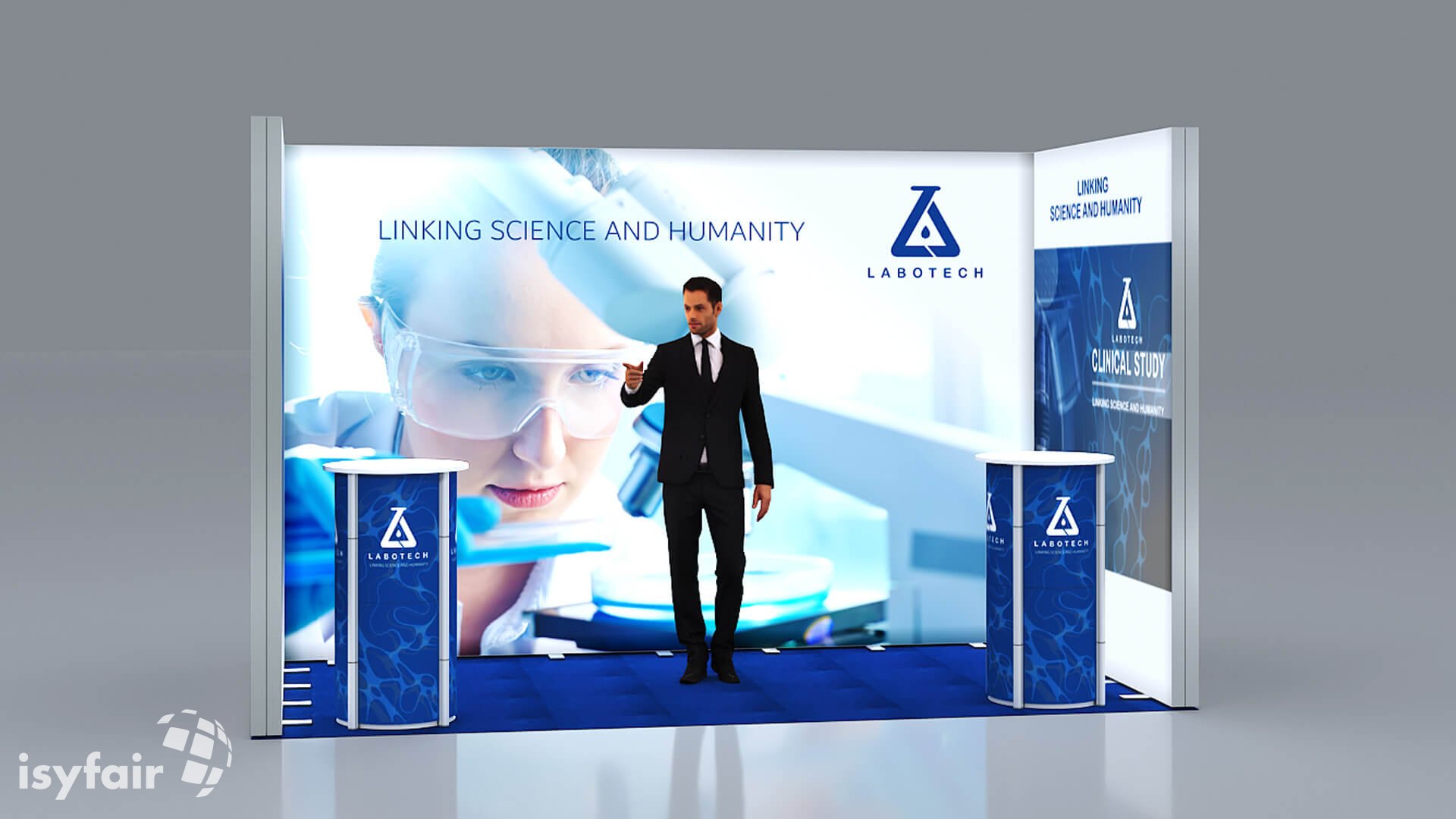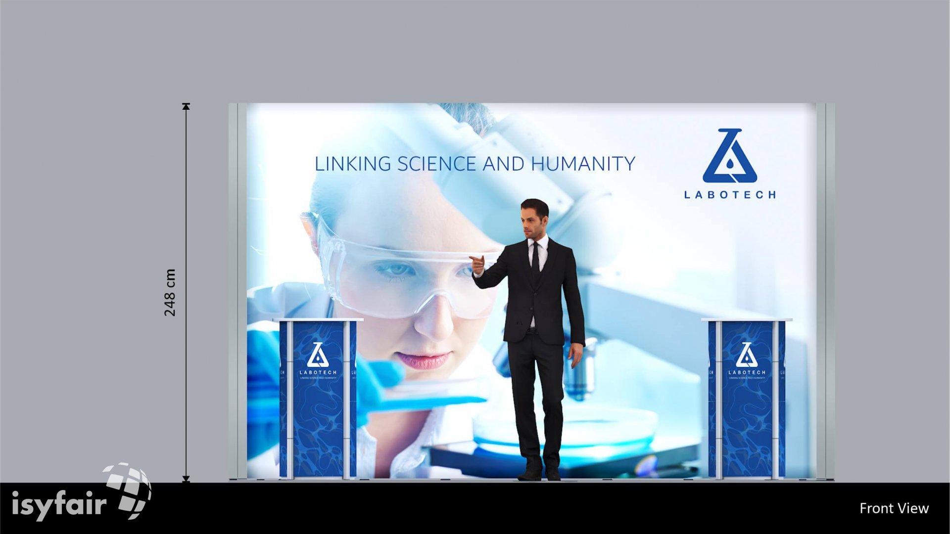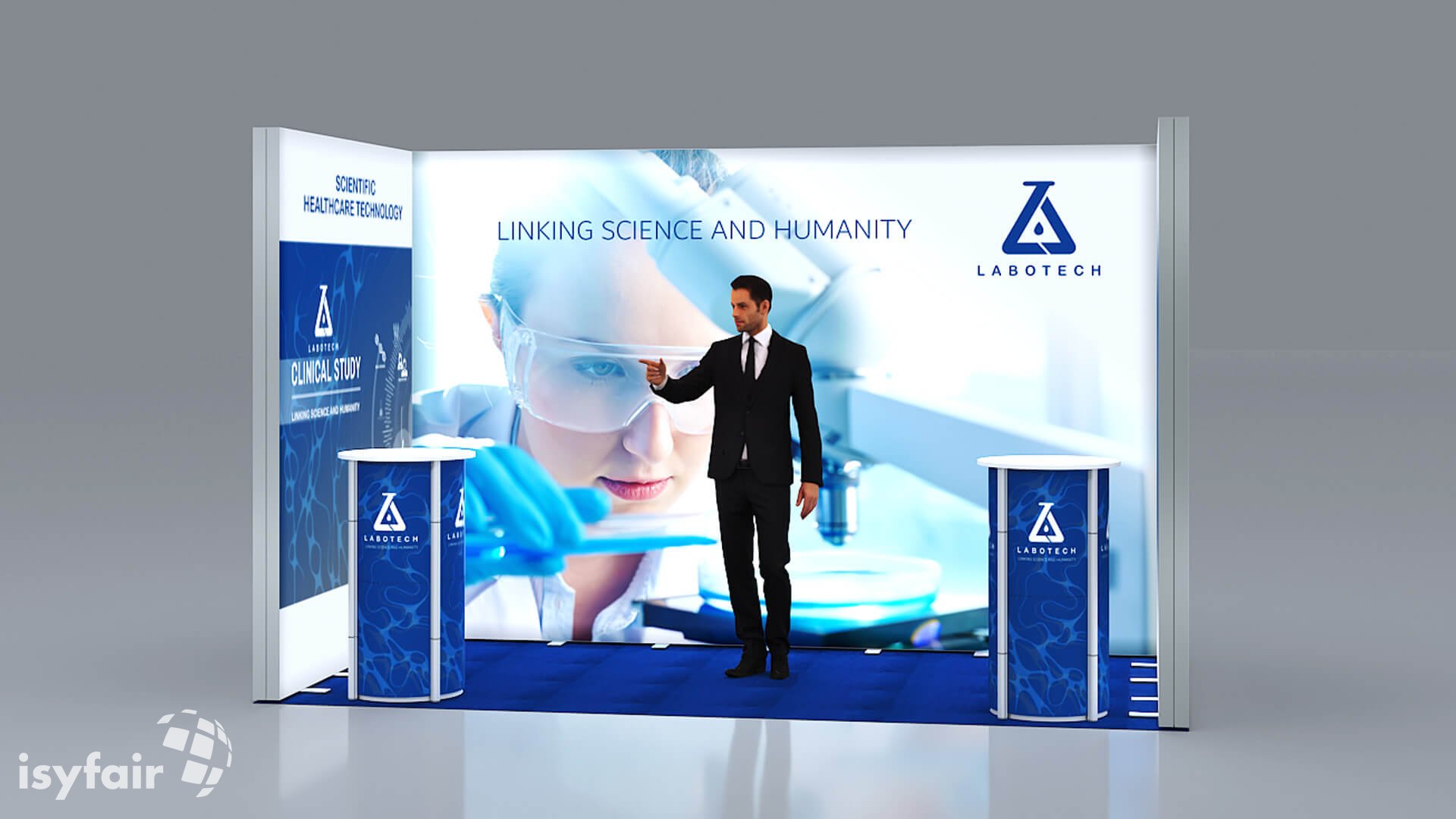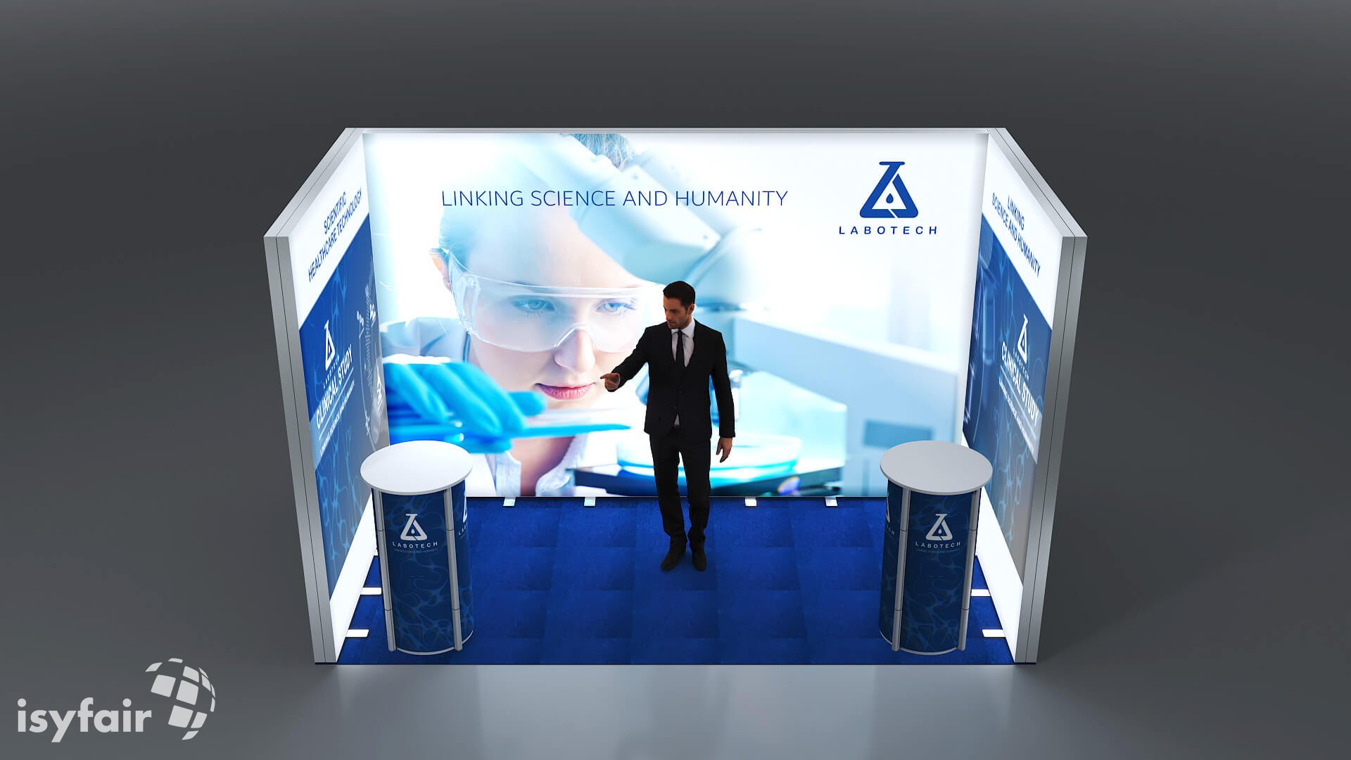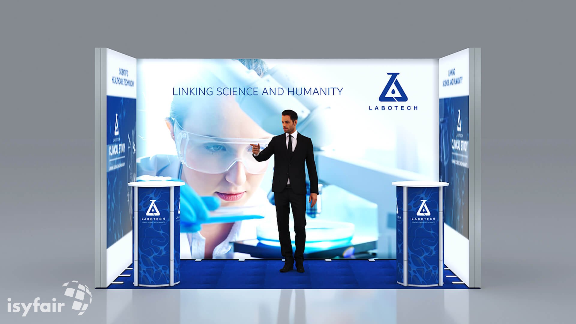 Dieses Messestand Design ist selbstverständlich an Ihre Vorstellungen anpassbar. Senden Sie uns dazu einfach eine E-Mail an - info@ISYFAIR.com oder rufen Sie uns an: +49 6722 9372-234